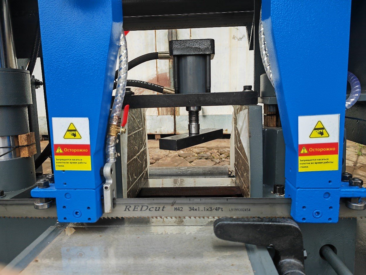 На данном станке осуществляется обработка в автоматическом режиме. В автоматическом режиме – станок самостоятельно осуществляет весь цикл резки: фиксация заготовки, опускание рамы, процесс резки, остановка пильного полотна, поднятие рамы, разжатие основных тисков, и продвижение заготовки.