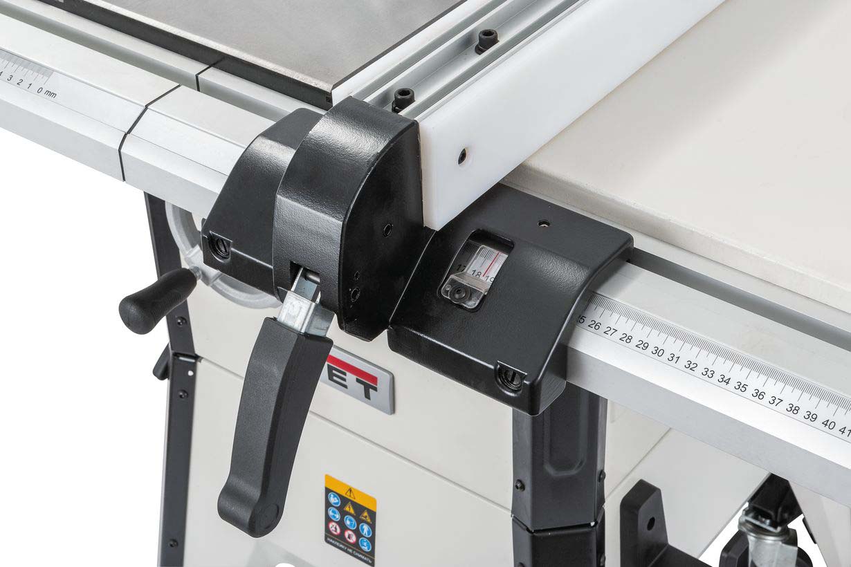 Основа станка – мощный литой из чугуна рабочий стол, к нему прикреплен пильный модуль из этого же материала, содержащий в себе привод диска и механизмы его наклона и погружения. К столу же крепятся стальные из толстого листа расширения слева и справа, а также составные направляющие с миллиметровой разметкой. Они дополнительно скрепляют секции рабочей поверхности и служат базой для параллельного упора. Он оборудован удобным эксцентриковым зажимом с двухсторонней фиксацией и обеспечивает быструю, удобную и жесткую настройку ширины реза. Его можно установить как слева, так и справа от диска, а также снять совсем (для хранения есть кронштейны на корпусе). Для торцевания и распиловки под углом есть транспортирный упор, скользящий по Т-образному пазу (они есть с двух сторон диска).