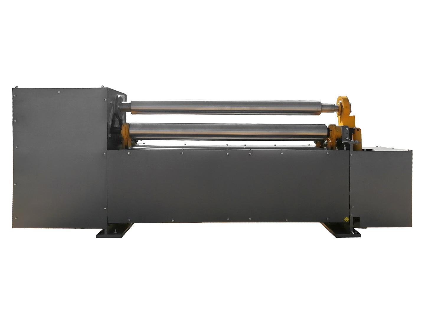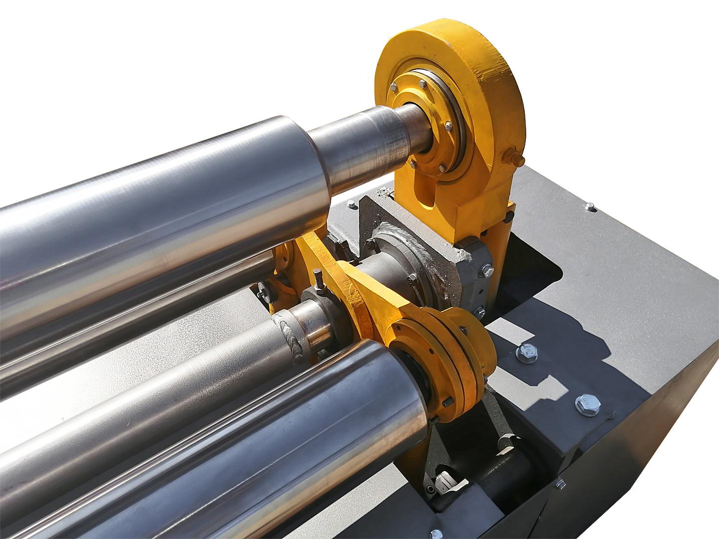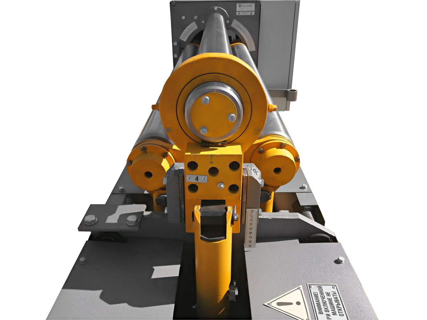 Правая опора верхнего валка размещена на правой стойке, а левая поддерживается откидной опорой, при откидывании которой можно снять готовое изделие с верхнего валка. Механизм регулировки боковых валков и механизм наклона откидной опоры имеют индивидуальные приводы.