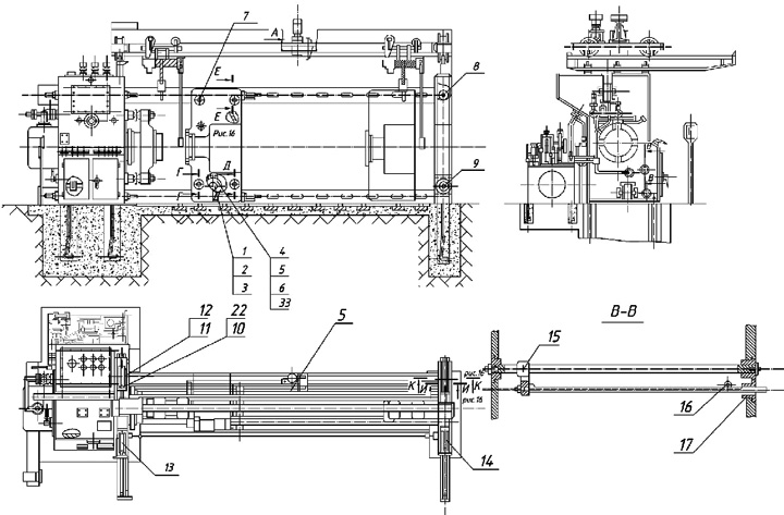 Заливка масла в редуктор привода упорной траверсы производится через отверстие 4 в редуктор привода механизма загрузки через отверстие 18.