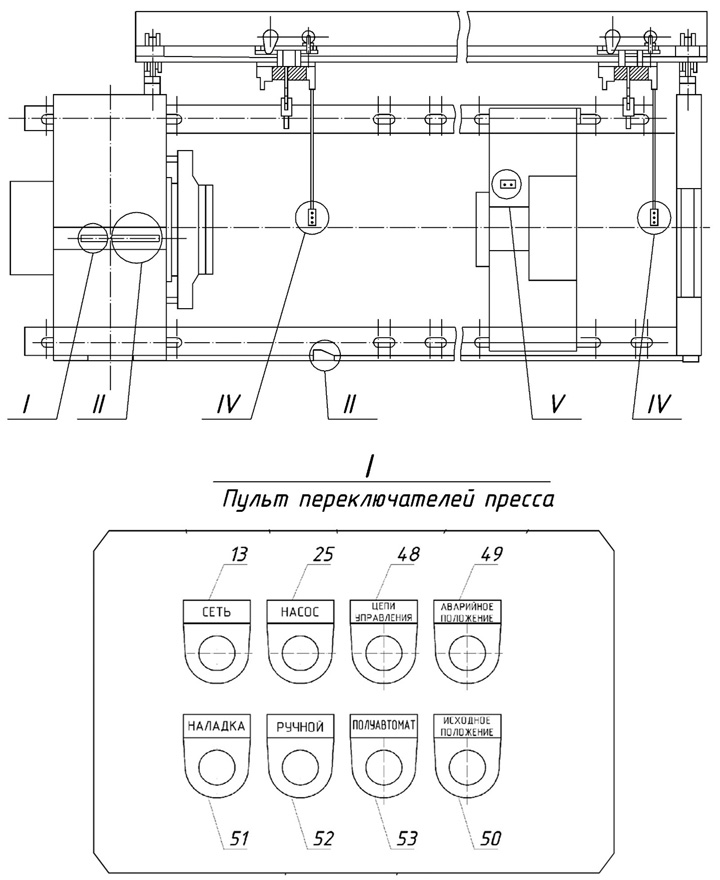 Все перечисленные конечные и путевые переключатели включаются при проходе над ними кулачка, закрепленного на рейке, жестко связанной при помощи кронштейна с перемещением плунжера пресса.