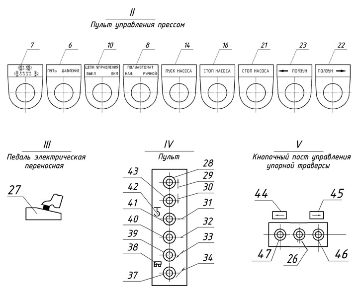 Управление работой пресса и главного плунжера осуществляется с пультов управления, расположенных на неподвижной части пресса, управление перемещением подвижной траверсы – кнопочным управления, расположенным на ней, управление перемещением грузоподъемного механизма – с кнопочных станций, расположенных на нем.
